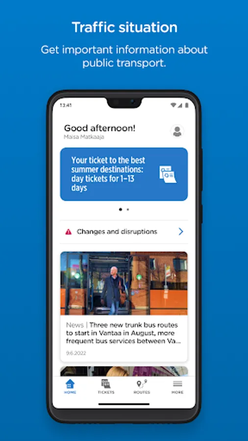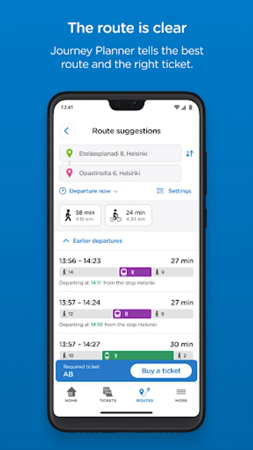 In addition to tickets, there is also a journey planner in the HSL app. Journey planner tells you e.g. the best route and the ticket, which is needed for the route. In the HSL app, you can also see up-to-date transport information for the areas and lines you have selected.