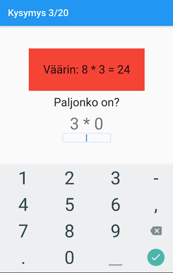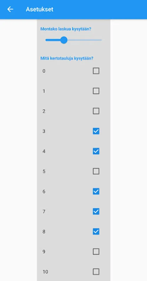 The program asks for 5-50 multiplication tables and keeps track of how many of them you got right. In case of an incorrect answer, the program will tell you the correct answer. Finally, you can see how many invoices you calculated correctly. If you want, you can set the program to ask only the multiplication tables you select (for example, six and seven multiplication tables).