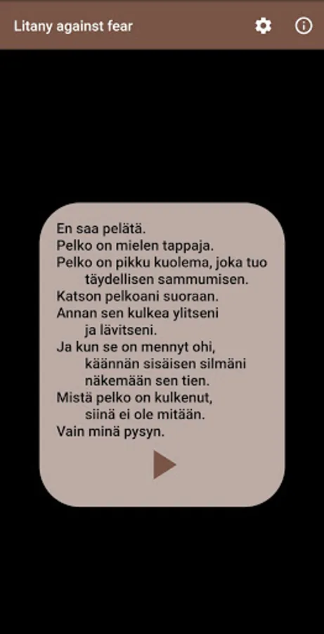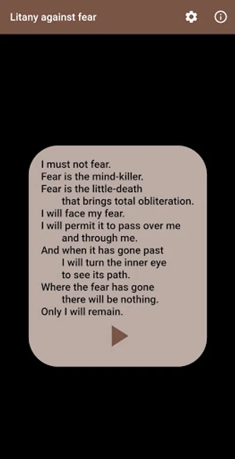 Whenever you feel agitated or unbalanced, you can use this app to ground yourself by reading or listening to the Bene Gesserit litany against fear.