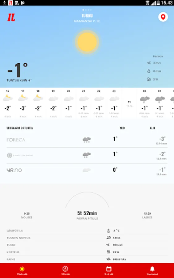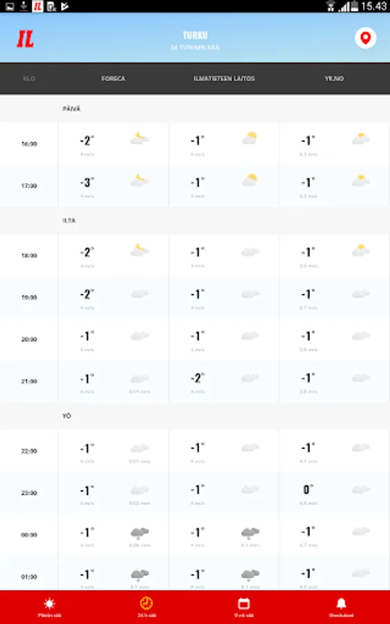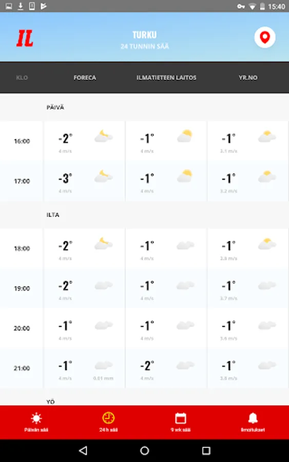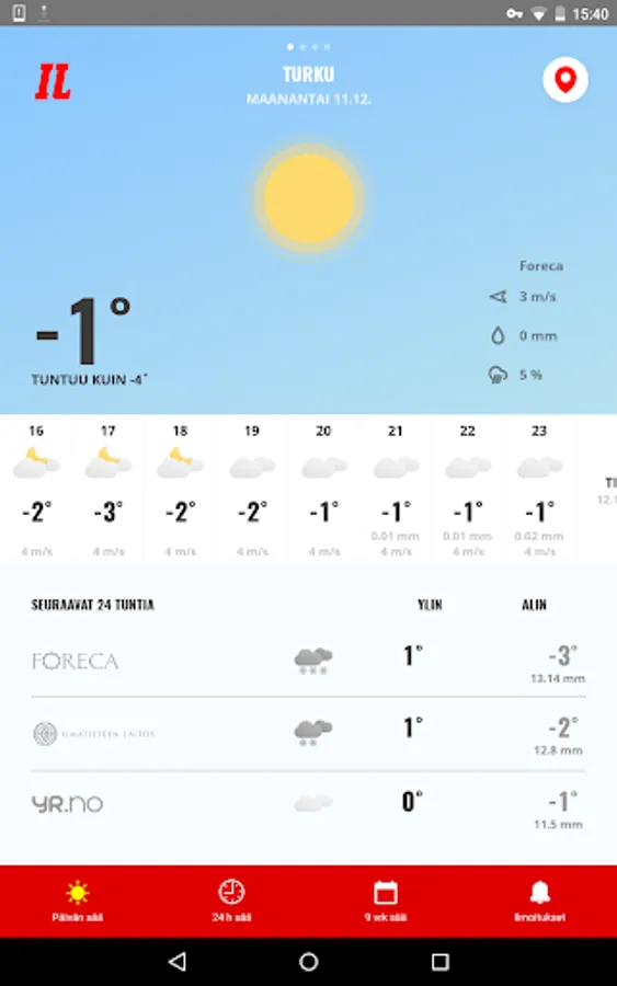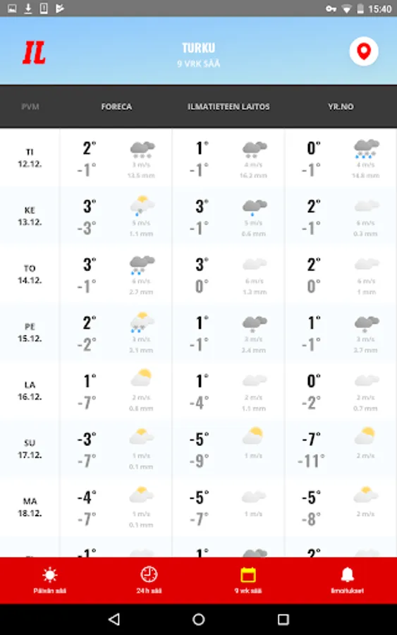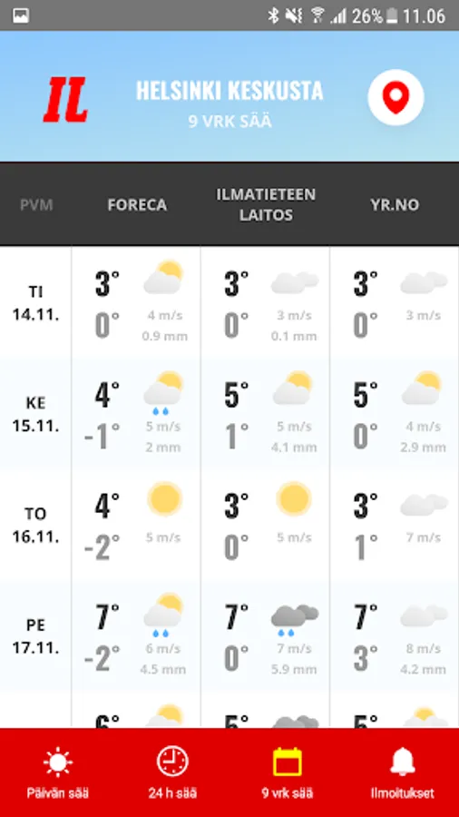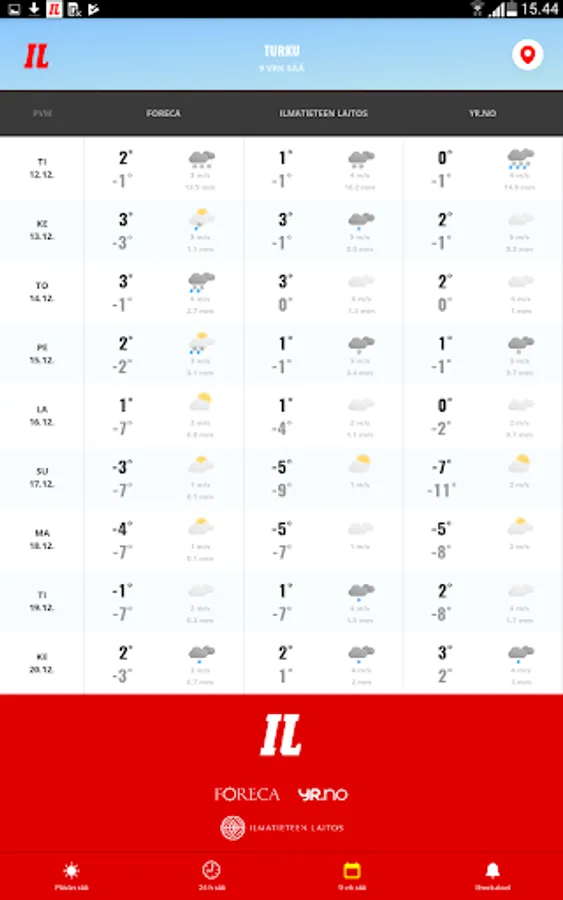 Compare the Finnish Meteorological Institute, and YR Foreca's location-specific forecasts so for today, for tomorrow than the end of the week as well.