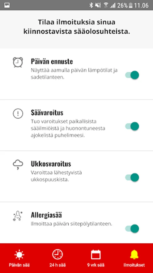 Subscribe to your location or your favorite place to weather warnings directly to your device's screen. You can order your own warning so bad a road weather, dangerous storm, pollen than ukkosestakin. You can order a snappy notice also save the day.
