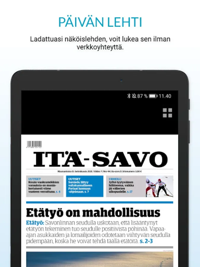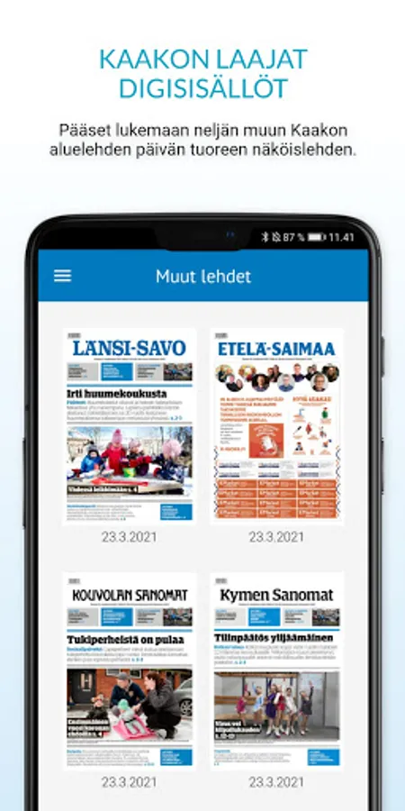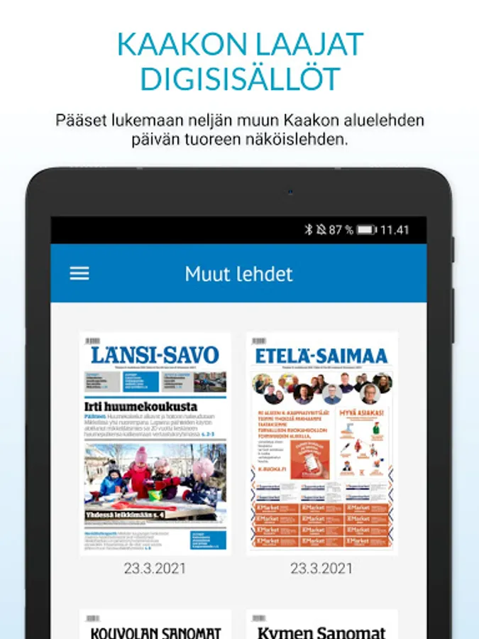 The application contains the latest published visual magazine as well as the magazine archive and appendices. You also have access to Kaakko's extensive digital content, which means that you can also read the latest magazines from Kaakko's four other regional newspapers with your daily newspaper application. You can also read magazines you download to the app offline, anywhere, anytime.