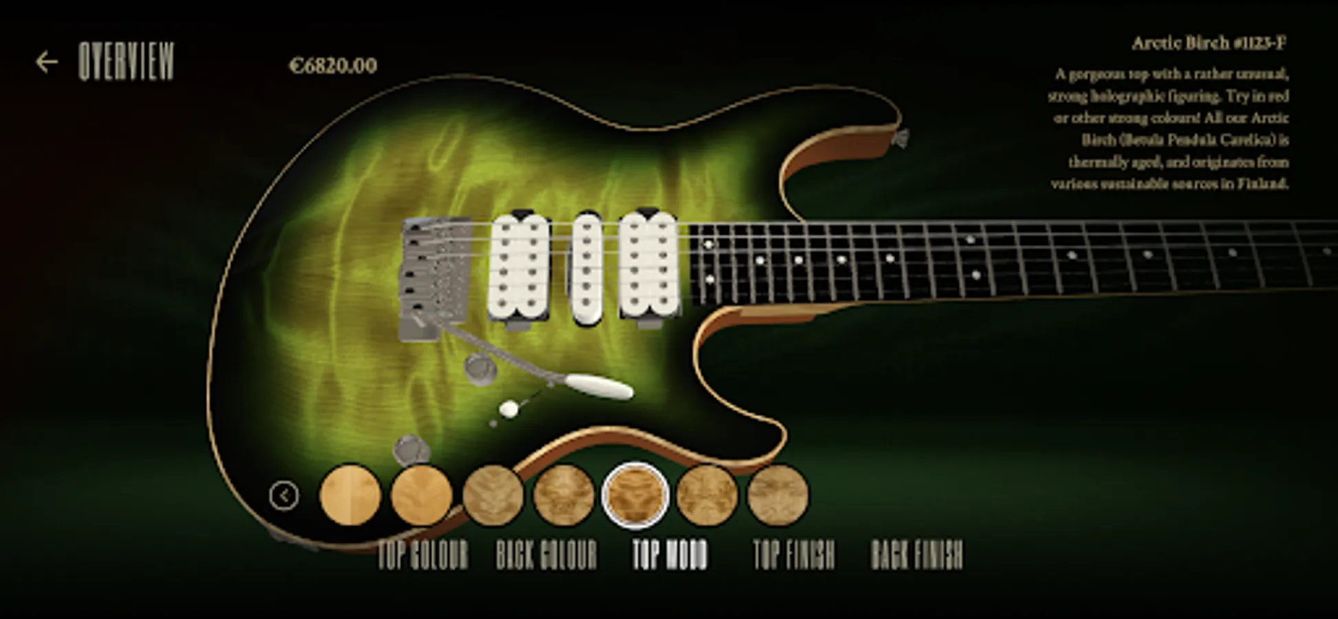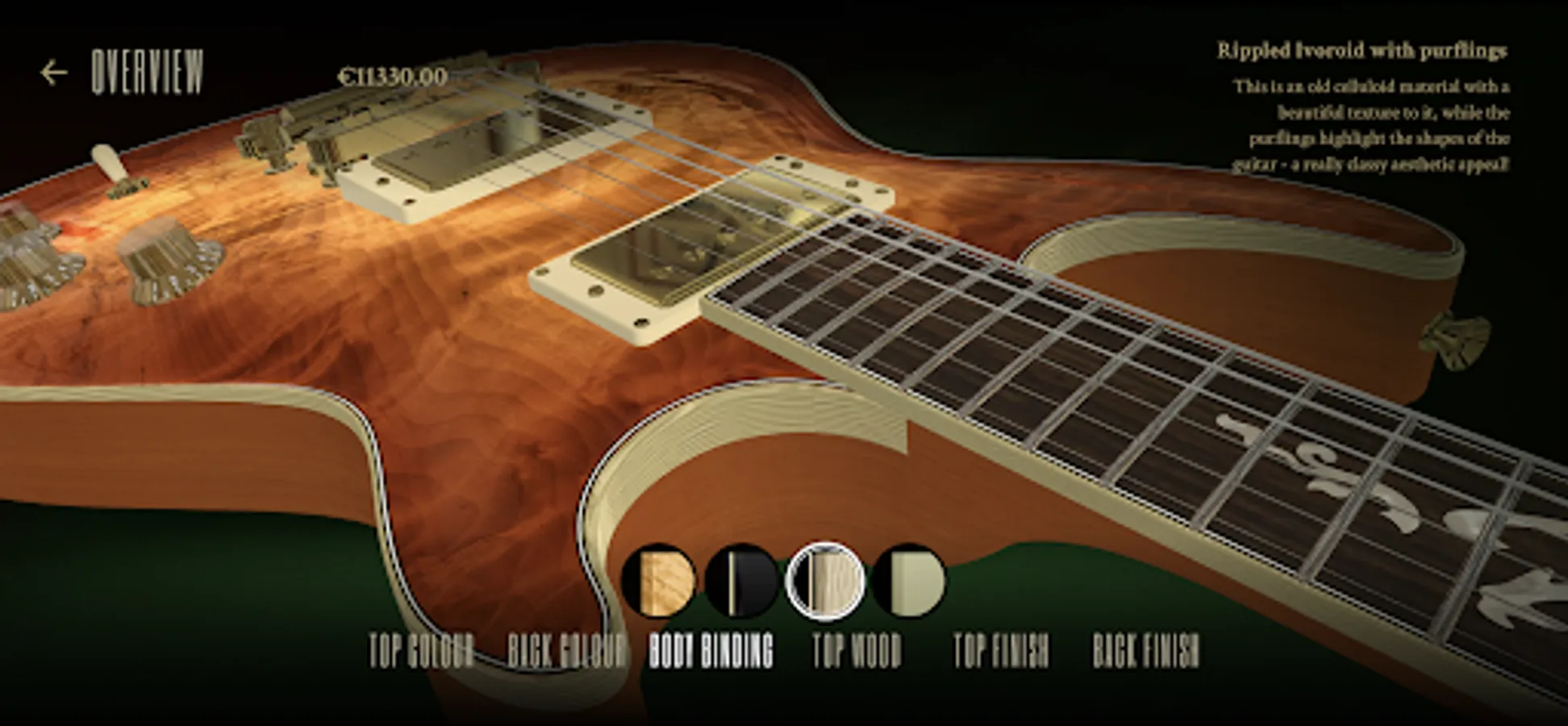 With the Guitar Creator you can become the designer of your dream guitar yourself. You can tailor the specs exactly the way you want from our carefully curated options selection down to such details as choosing the pickups, bindings, neck profile, fret size and much more.