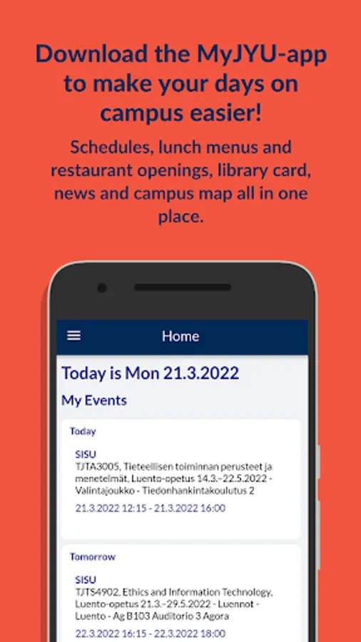 MyJYU has been developed to make students’ lives easier. It includes everything you need in your daily student life: study calendar, University of Jyväskylä’s news and events for students, library card and also IT bulletin. You can find your favourite campus restaurants’ menus, food prices and ingredient lists from MyJYU. To navigate easier on the campus, you can use the built-in campus map. MyJYU also contains job and internship listings aimed at students, as well as list of classes provided by uMove.