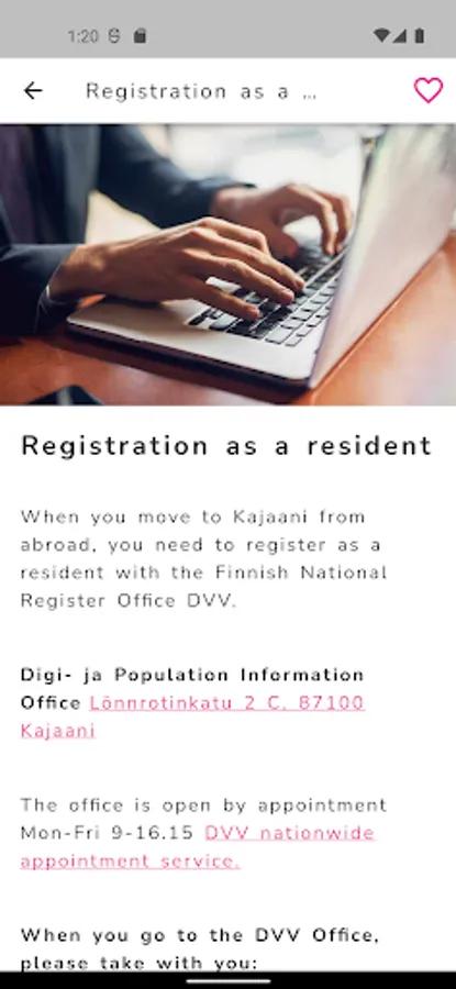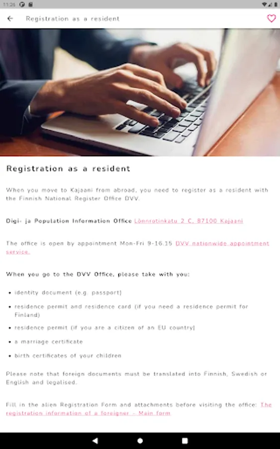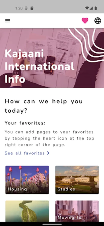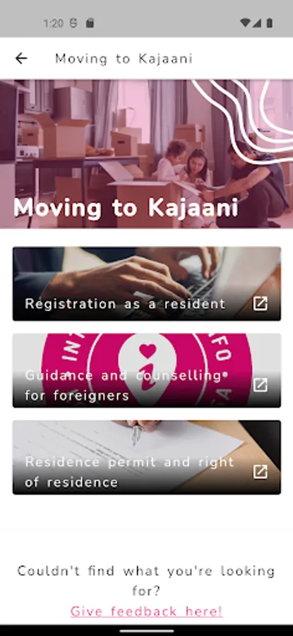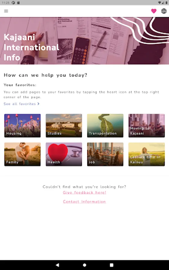 The City of Kajaani International info service application helps immigrants to find information independently about various practical issues related to living in Finland and Kainuu. The app guides the customer through different service paths such as health, work, housing, mobility, school, family or leisure services. The service paths help the customer to find the practical information they are looking for, for example, which health services you belong to, how to book time for these services, how to read the local bus timetable, what kind of hobbies are available in the area. Through the app, the customer can directly contact Kajaani International Services if the information they are looking for cannot be found in the app or if they have specific questions.