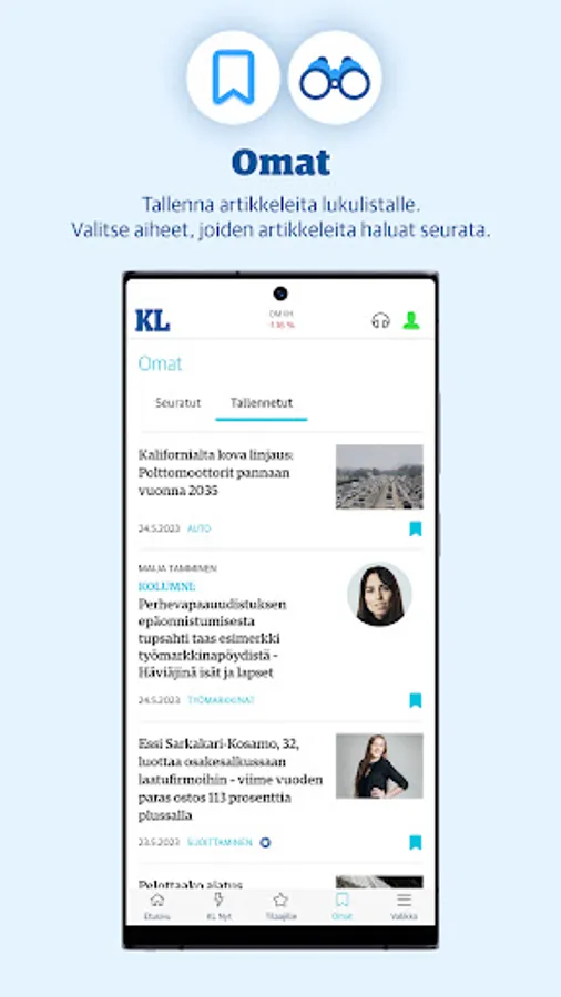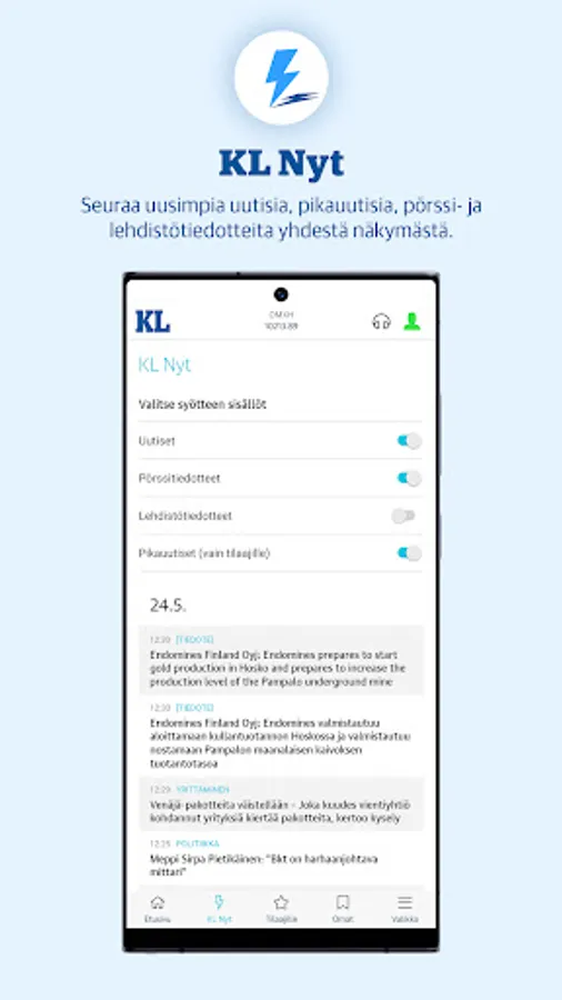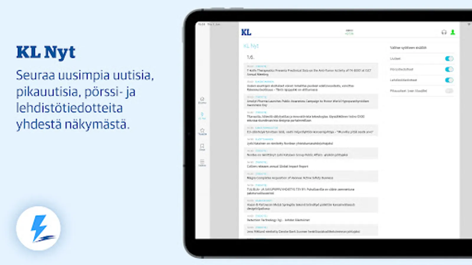 In our application, you can read news on diverse topics, such as investing, shares, stock market, digital, working life, entrepreneurship, housing and cars. The KL NYT section keeps you updated on the latest economic news and stock exchange announcements.
