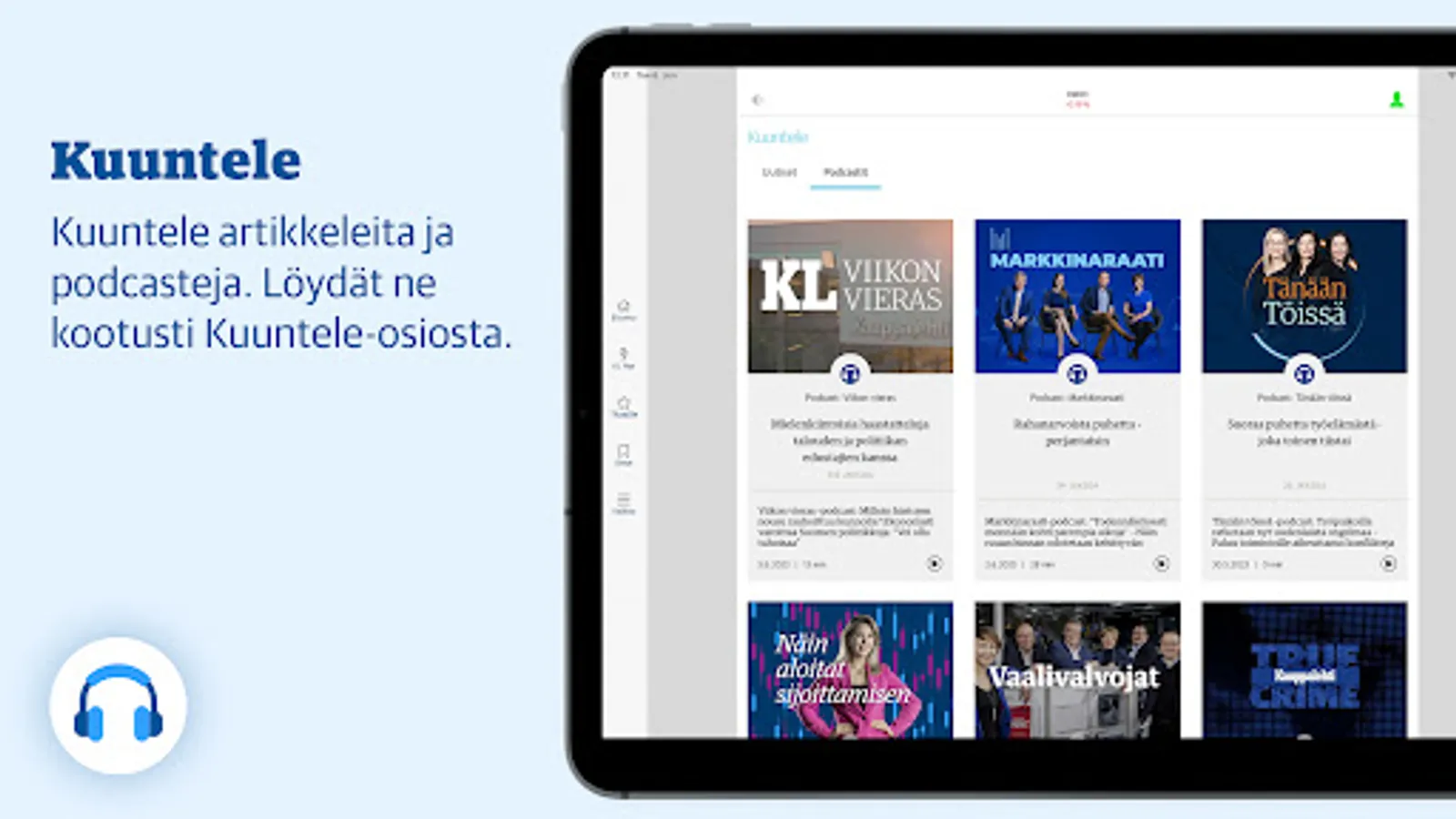 - Listen to our content. You can listen to Kauppalehti's contents, such as news and podcasts, in the Listen section.