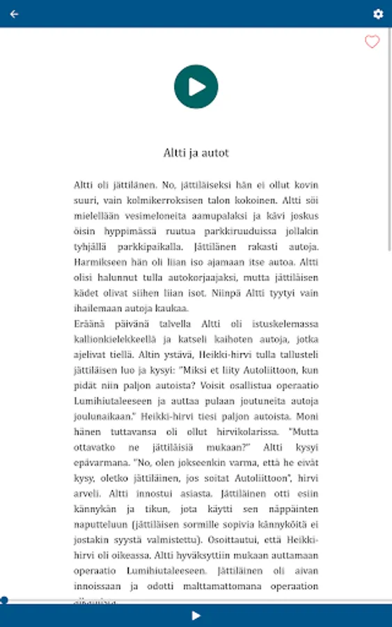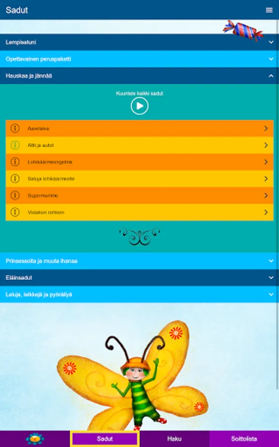 This is Satuaapas 4, which contains 30 new fairy tales. The Satusaapas application is a Finnish children's fairy tale application, where you can listen to and read fairy tales written by fairy tale writer Päivi Tuulikki Koskela. The fairy tales are read by musician and voice actor Mikko Koskela, who has also composed the theme music of Satusaappa. The fabulous graphics are the work of artist Petronella Grahn.
