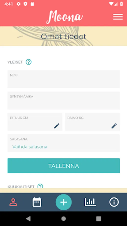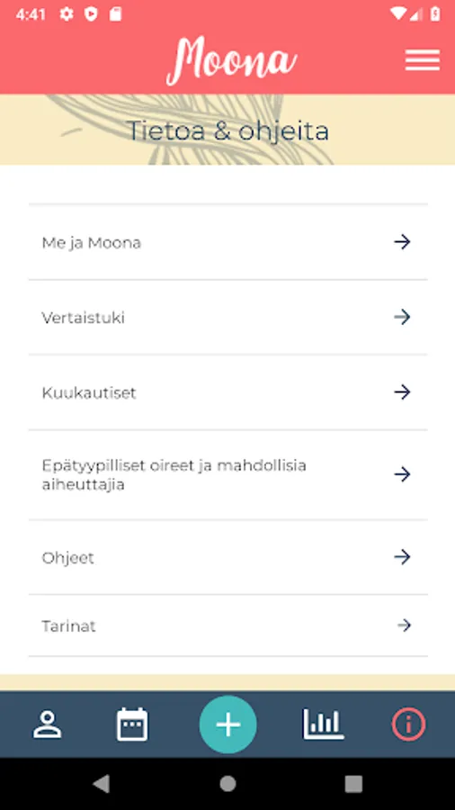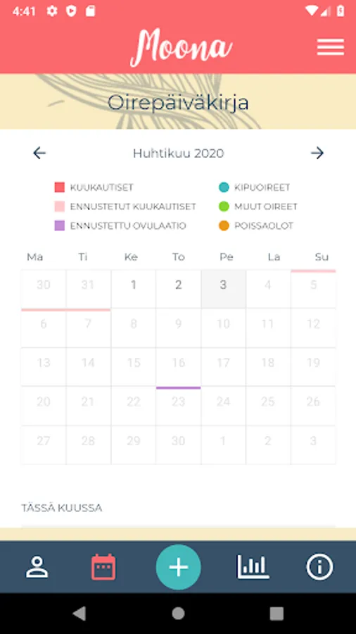 Moona Symptom Diary is a monitoring application for menstrual cycle and related symptoms. Moona is especially suitable for people living with or suspected of having a gynecological illness or syndrome. The app is suitable for monitoring a wide range of symptoms and also for those who do not have menstrual bleeding.