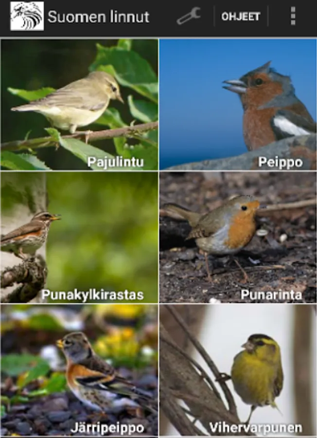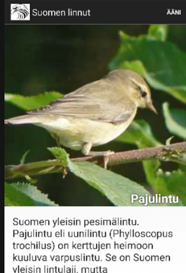 This application introduces the most common birds in Finland.Texts are in Finnish only. If you can't speak Finnish you can always view the pictures and listen to bird songs. Or you might want to start learning Finnish today!