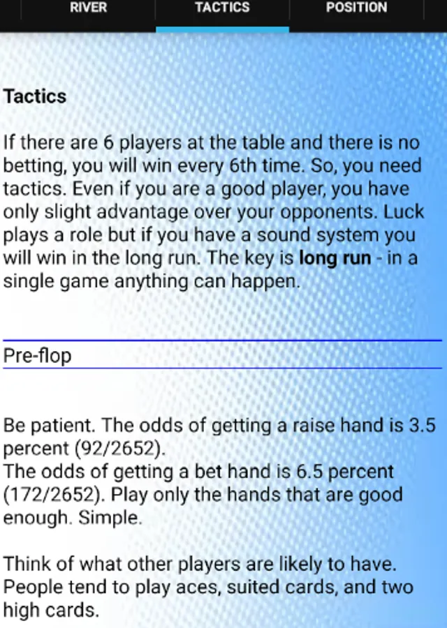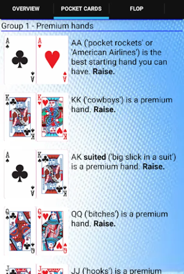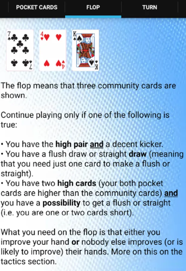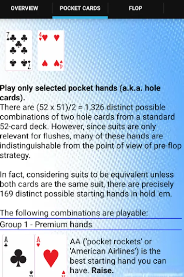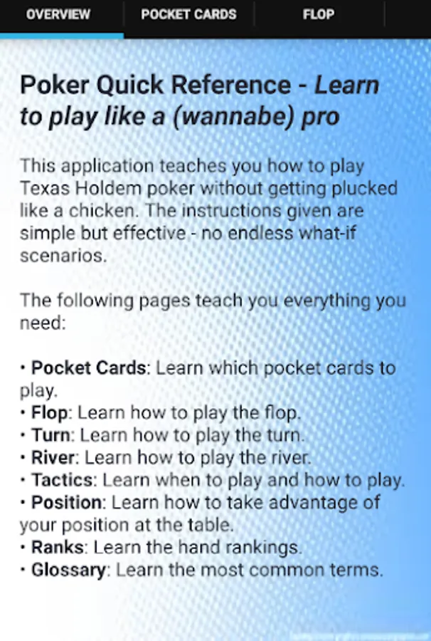 A quick reference put into a very concise form to help you play Texas Holdem Poker. Free. No ads.