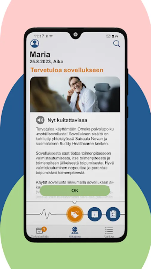 The Omaks service path application offers the user all the information related to treatment in an easy-to-understand format. From the timeline, the patient can see events and tasks related to their treatment and acknowledge them as completed.