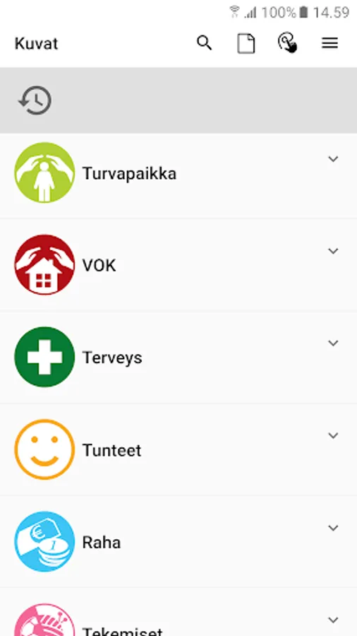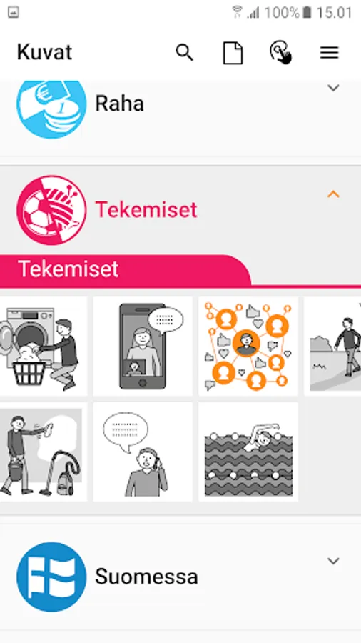 The app contains 1000 images of subjects depicting Finnish everyday life, society and asylum. Images are divided into different categories and can be searched by keywords. You can supplement the pictures by drawing or adding text to them. You can also import your own images into the application and combine them with other images.