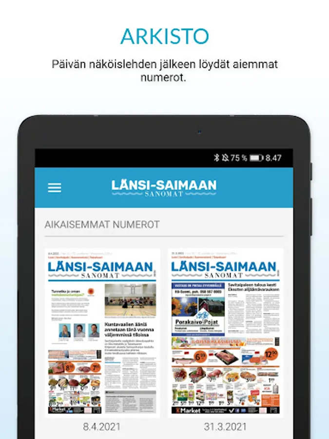 The application includes the daily magazine with its attachments as well as a digital magazine archive. You can also read magazines you download to the application without an online connection.