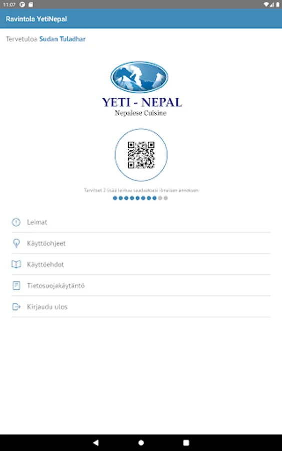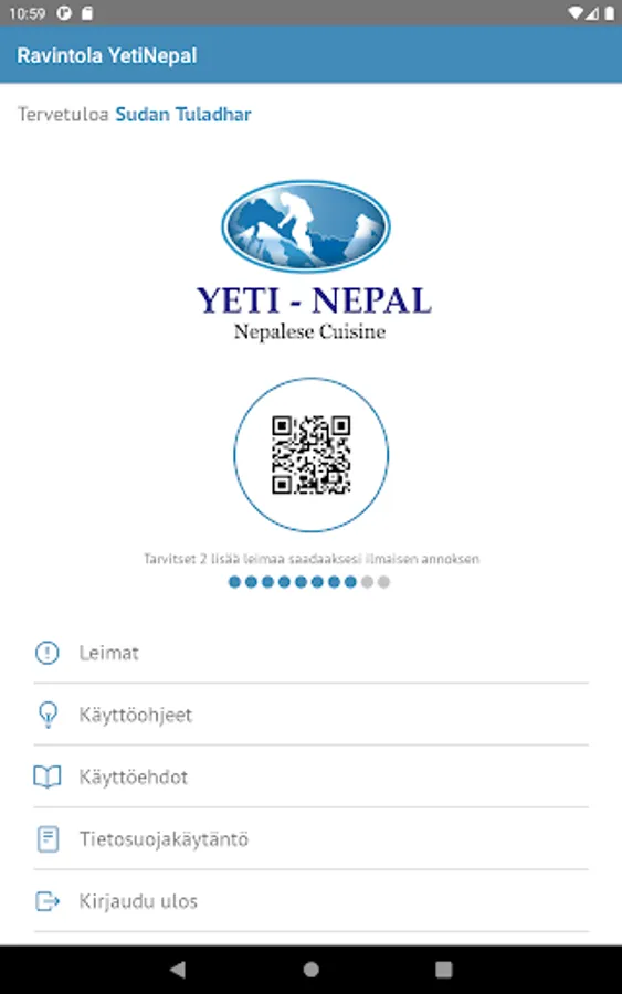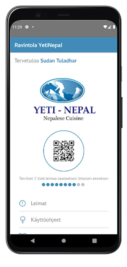 The YetiNepal Loyalty app is the customer Loyalty app for our restaurant. We believe our customers are the most important partners of our success and through the YetiNepal Loyalty app, we are giving back something to our customer. Customers can visit restaurants and get their coupon QR code scanned at the POS terminal. Each scan Grants the use a coupon. When the user has received a certain number of coupons in the app, the user will get a free meal.