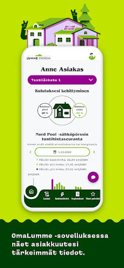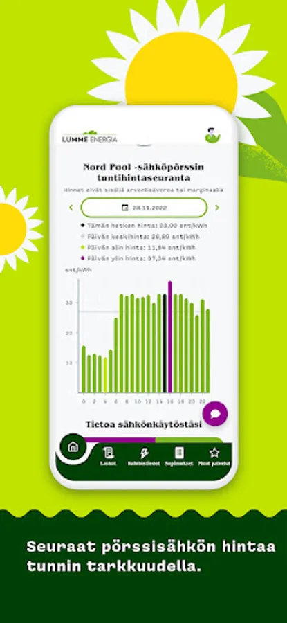 The OmaLumme application is a service where you can see the most important information about your customer, such as energy consumption, contracts and invoices. You can also conveniently follow the price of electricity on the stock market with an hourly accuracy. We are constantly developing the application to serve our customers even more versatile. The application is used by consumer and business customers of Lumme Energia.