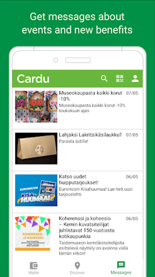 Wallet includes all loyalty and member cards saved to Cardu. You can easily find your membership card in the Wallet when you need it. It’s also possible to store your coupons and stamp cards in the wallet—this way, you will find them easily when you need them.