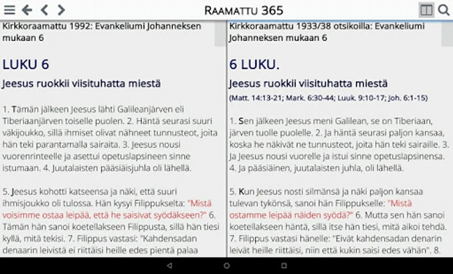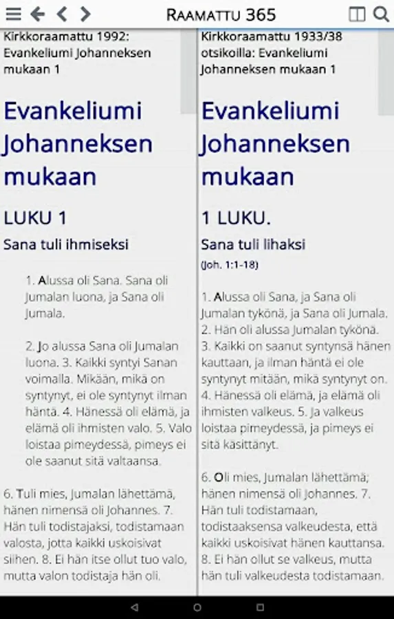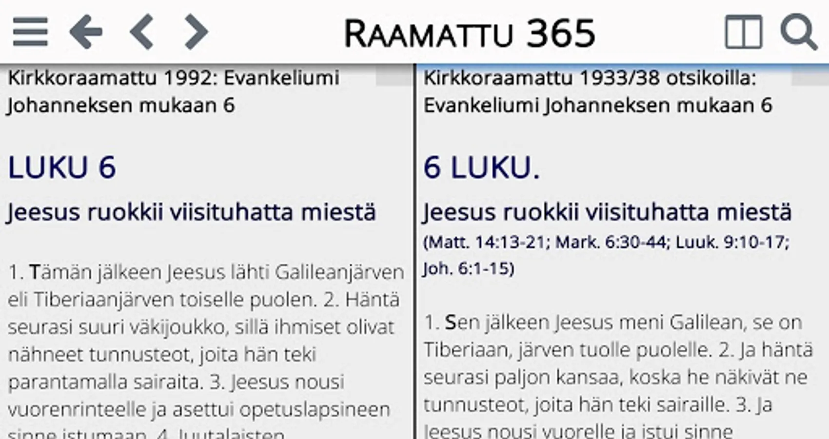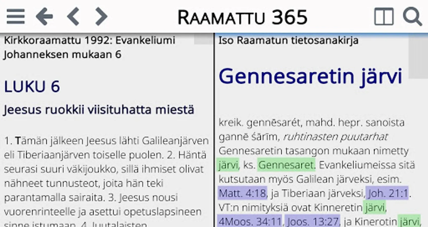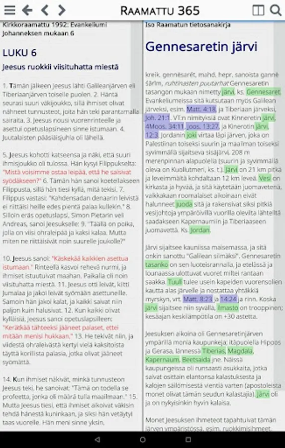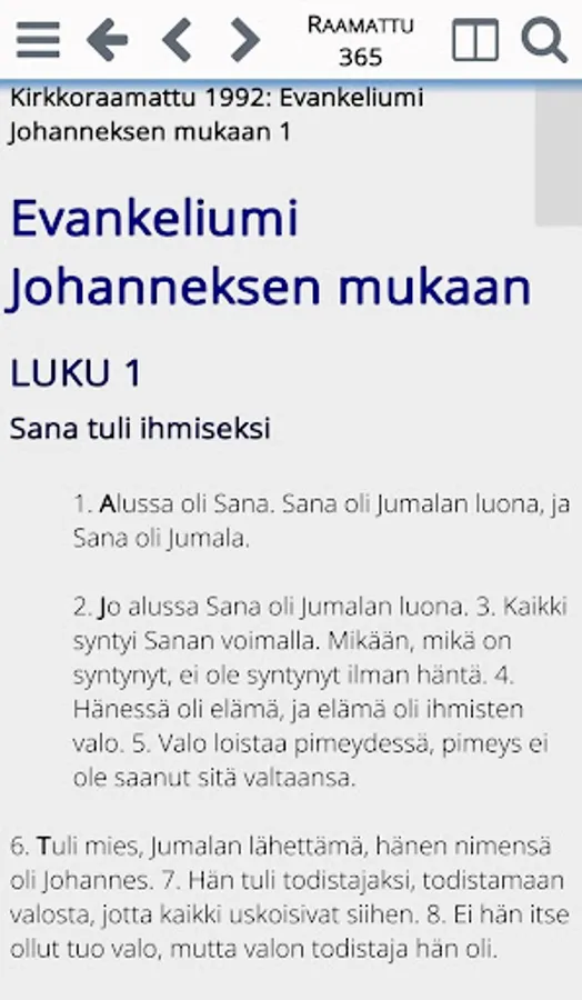 The completely redesigned Bible 365 application enables you to use Raamattu365.fi without an Internet connection. To install Bible translations, you will need an Internet connection and will be successful without a username. Installing and using additional content requires a username for Raamattu365.fi. The basic use of the service is free.
