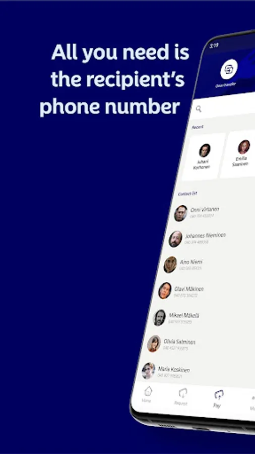 All you need to transfer money is the recipient’s mobile number. Enter the amount and swipe, and the money will be immediately transferred from your bank account to the other users bank account.