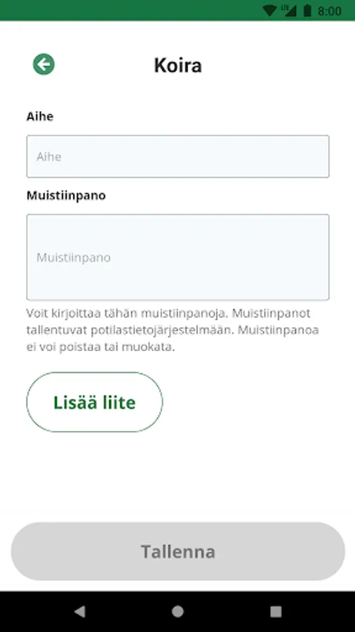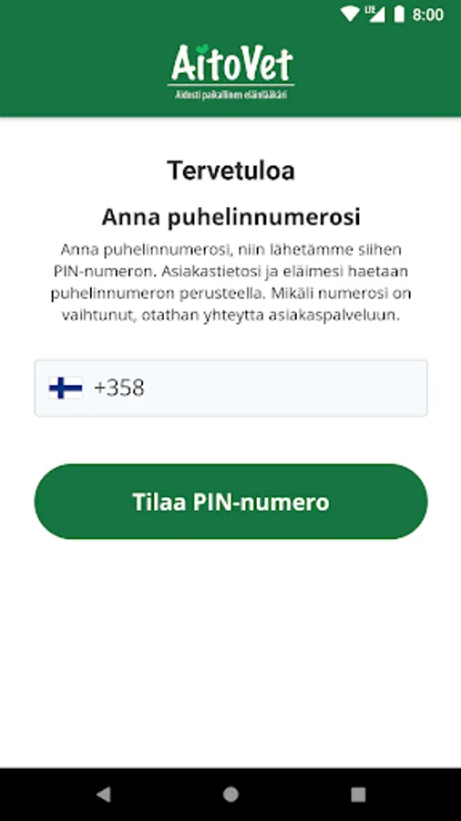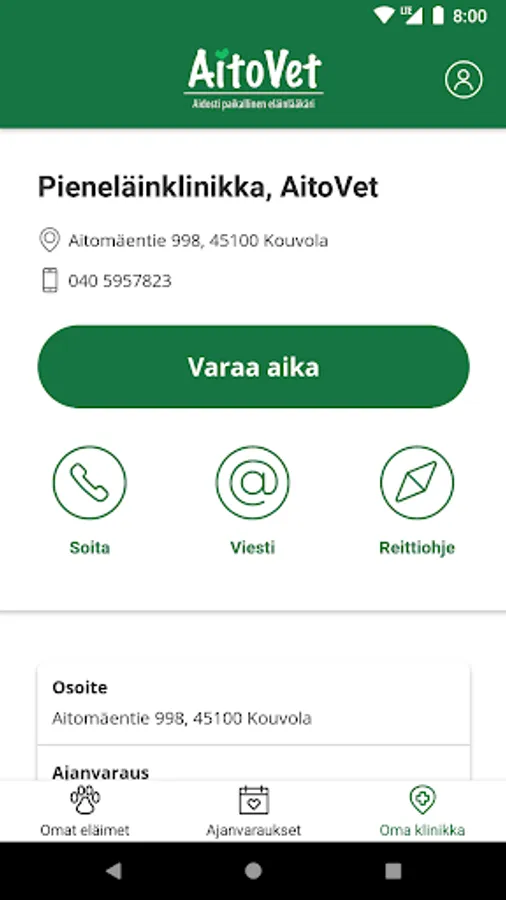 AitoVet offers its customers the opportunity to view their pets' care information and easily make appointments at the AitoVet clinic. For example, you can easily check the up-to-dateness of vaccinations, follow-up treatment instructions and laboratory results. With the application, you can also save your own animal care notes and save your pet's picture in the animal's health card. Logging in is done with the phone number you entered in our patient database, to which a password for logging into the application is sent as a text message.