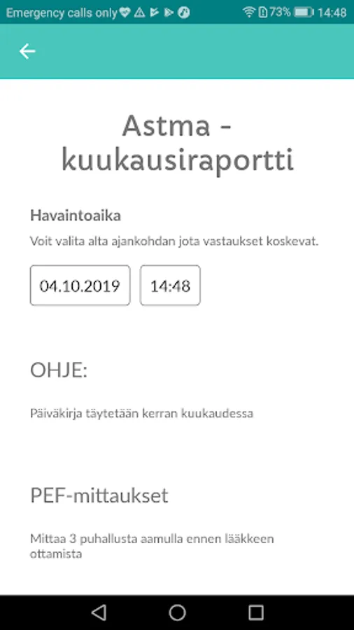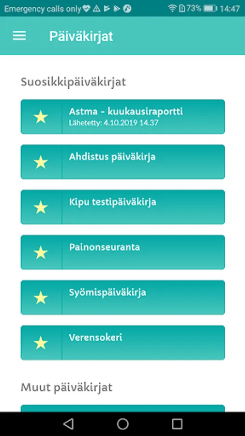 The diary application is intended for data entry and data transfer, i.e. the application itself does not contain calculations, graphic generation or alarms. Treatment monitoring always takes place on the digital treatment path under the supervision of a professional. The diaries in the application can also be connected to the self-care programs on Omapolu, in which case the diary information is only visible to the user himself.