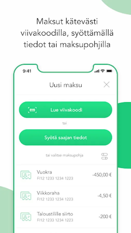 - Make payments by reading barcode information, entering data or using payment templates