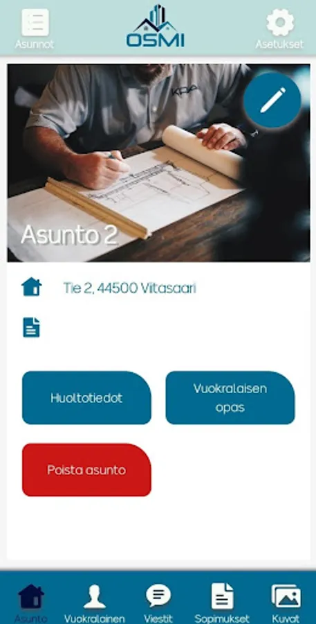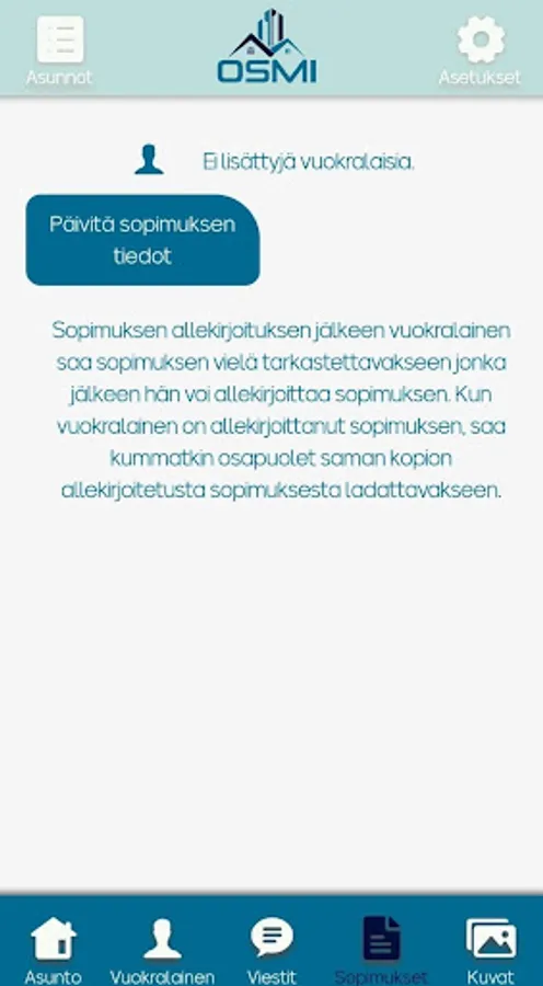 Lease management is now easier than ever. Keep all your rental agreements and information in one place, keep the signatures related to the agreement electronically and keep in touch with your tenant. With the OSMI app, you avoid paperwork related to renting, and take care of tenancy-related factors easily and safely, even from your home couch.