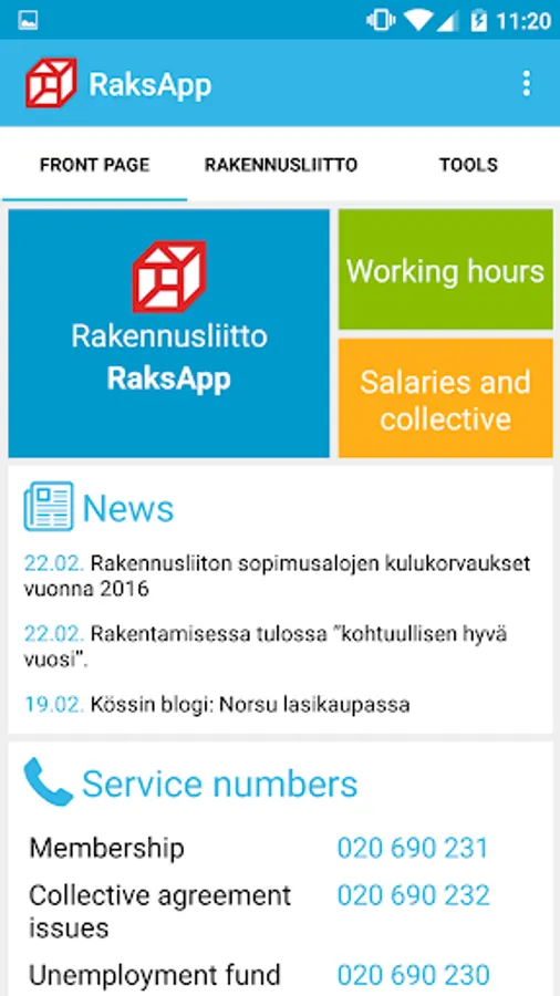 The RaksApp application is an electronic tool offered to the members of the Finnish Construction Trade Union for recording their working hours. You can download the application on your smartphone free of charge. RaksApp contains the collective agreements of the contract branches of the union, updated summaries on salaries and compensations, and a membership fee calculator.