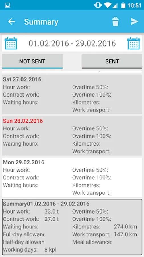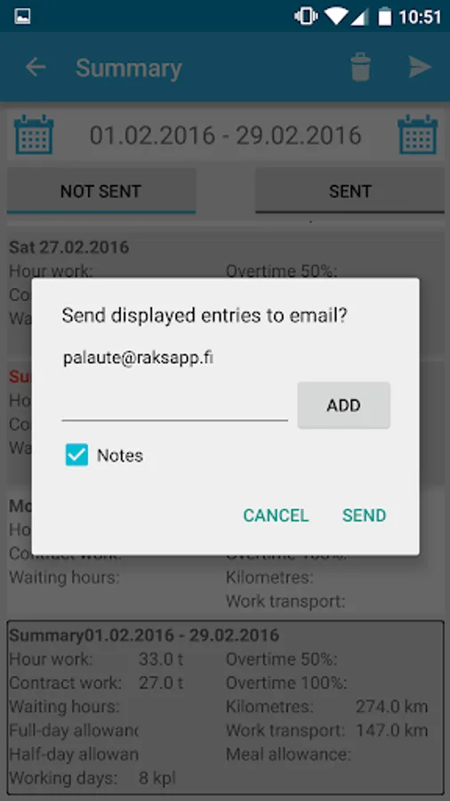 The working hour records are stored on your device. You can send a summary of your accounting period to your email.