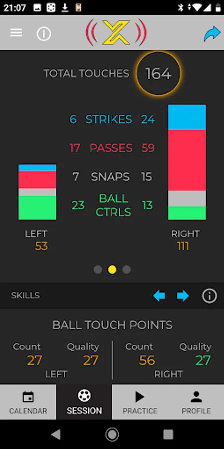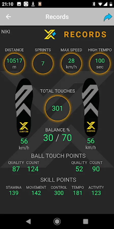 How many times did I touch the ball during a match? How many of the contacts were passes, strikes, ball controls and lighter snaps? Which foot did I use more? Which part of my foot did I use most when kicking the ball? What is my maximum strike speed?