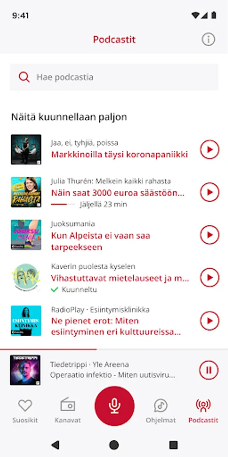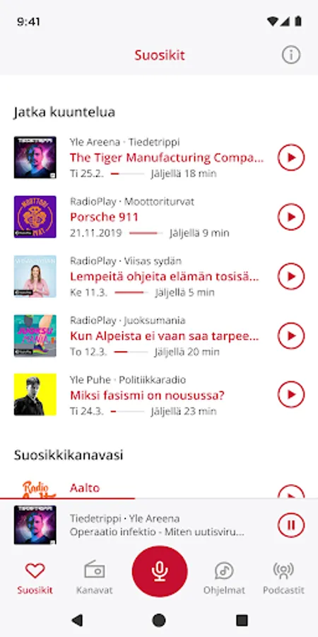 Radiot.fi is a joint project of the Finnish radio world, the service is owned by Yleisradio and RadioMedia, which represents commercial radio stations. The service has almost 100 domestic radio channels. You can listen to channels, programs and podcasts, check out the day's programs and find more to listen to. It's easy to put your favorite shows on your favorites list, and you can request a reminder of all your shows, either individually or individually.