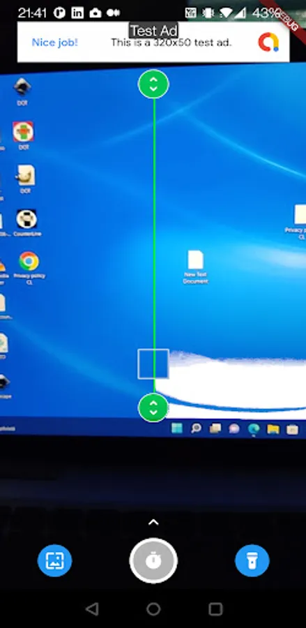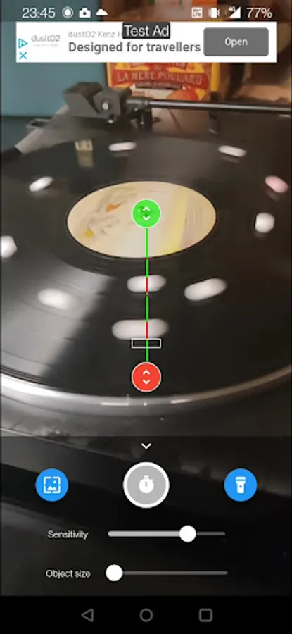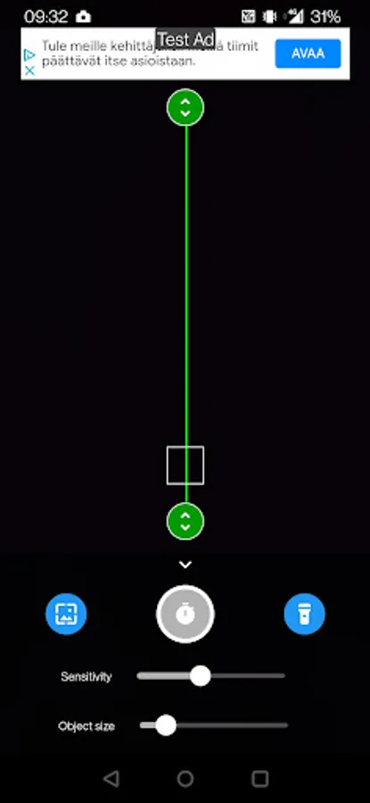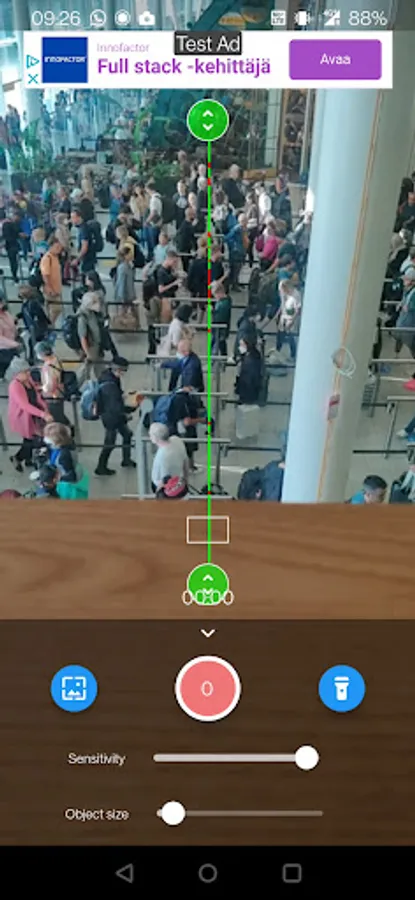 If the line in the middle of the screen is not totally green when nothing passes, reset the background with the left button. To prevent that the background is recorded, it is possible to adjust the sensitivity and the minimal object size with the sliders. Try to hold your phone as still as possible.