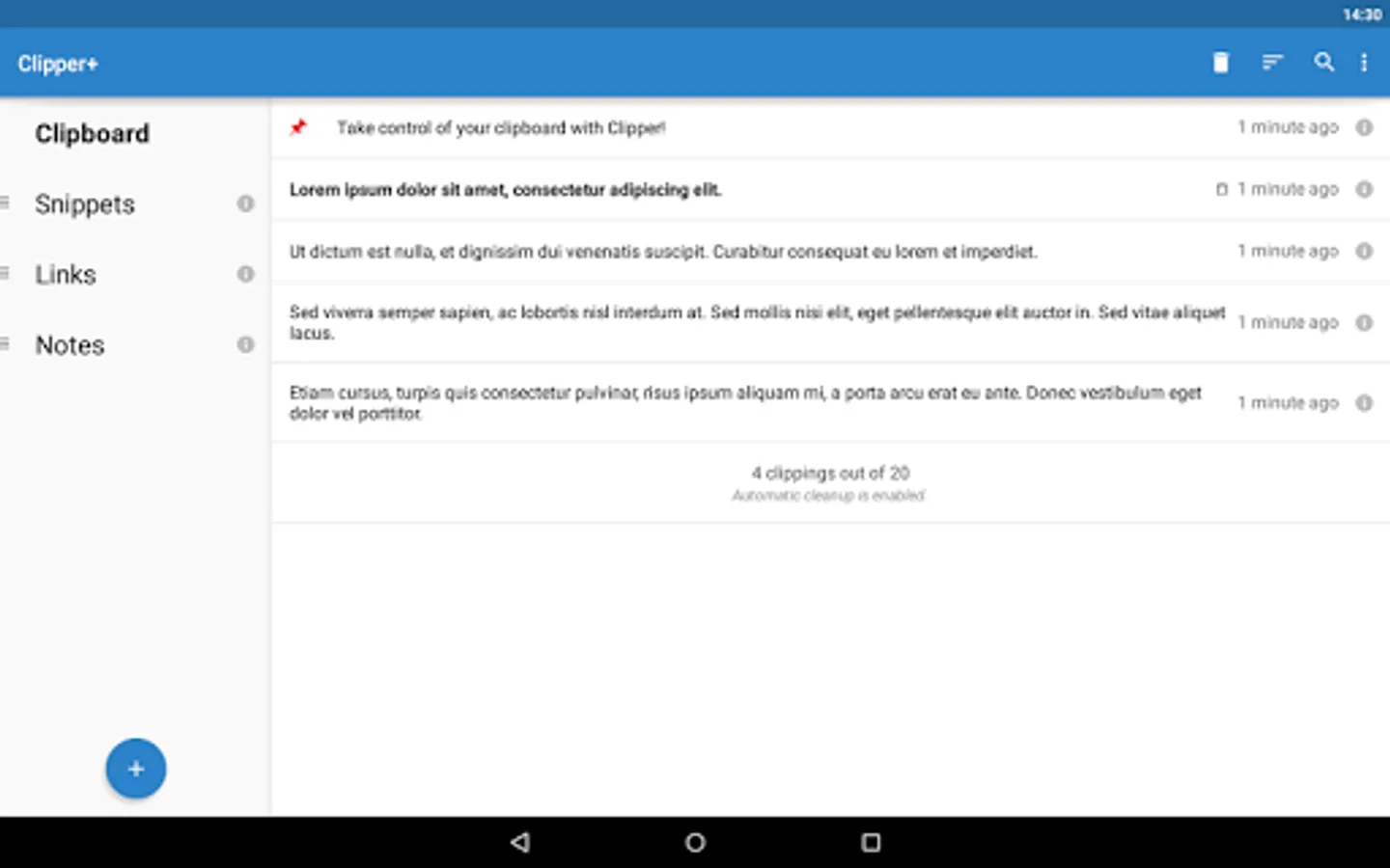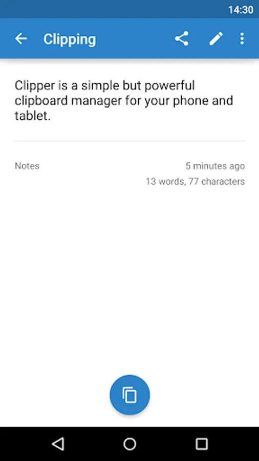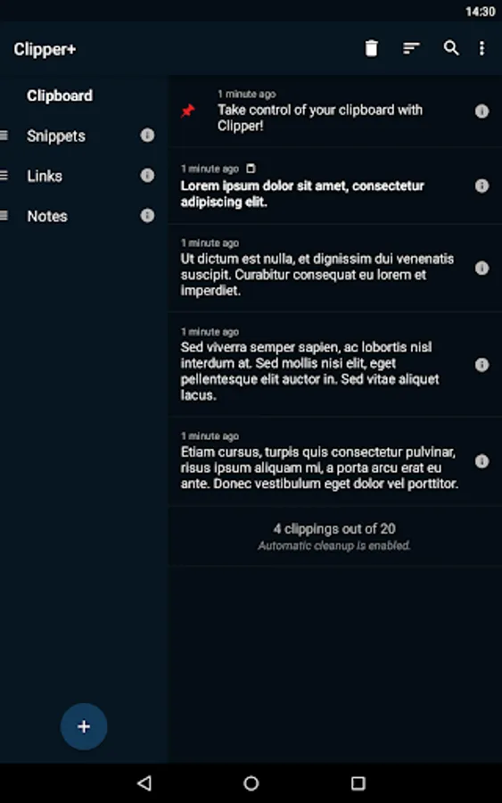 ✔ Quick and easy access. Open Clipper through your status bar for quick access to your collection. Predefine quick snippets for easy copying and take your notes in Clipper.