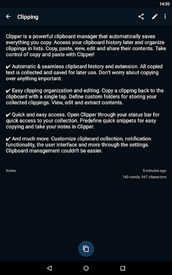 Clipper Plus is a powerful clipboard manager that automatically saves everything you copy. Access your collected clippings later and organize them in lists. Copy, paste, view, edit and share their contents. Store repetitive pieces of text in Clipper and copy them whenever you need to. Take control of copy and paste with Clipper!
