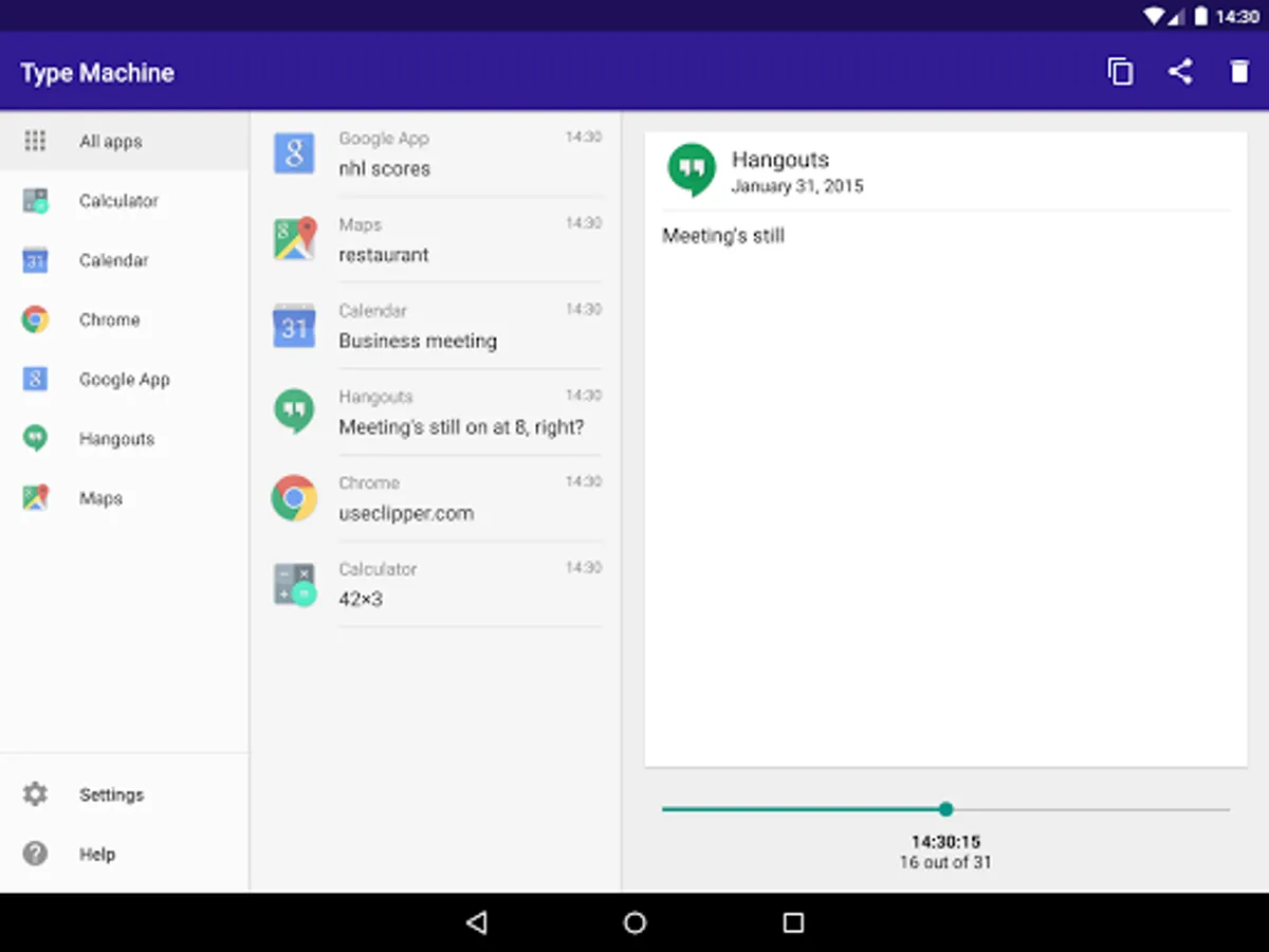 Type Machine saves everything you type in every app. Open it at any time to find old entries. Filter them by app. Drag the history slider to see what you typed letter by letter. Tap to copy. Never lose a piece of text again!