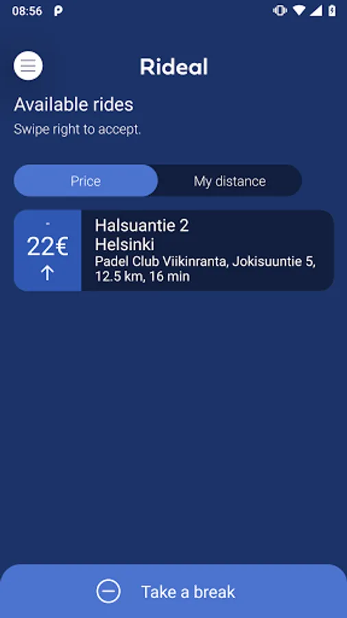 The app for Rideal taxi drivers to see and accept new taxi rides. The best feature is that you as a driver get to decide when the price is right for the gig.