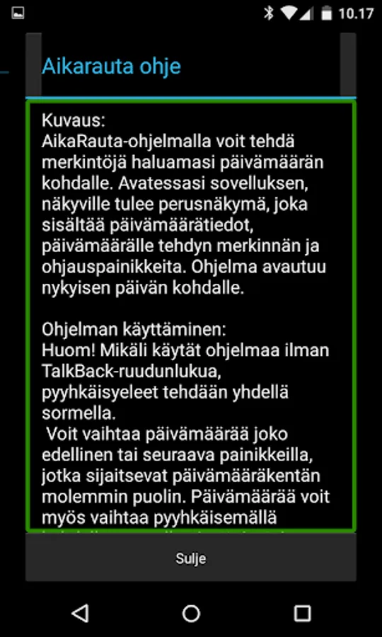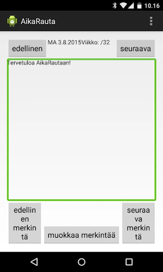 Aikarauta is a simple calendar application that lets you make daily blocks posts. You can use the application as a simple calendar or even a diary. Account has been taken, in particular the availability TalkBack screen reader, as well as physical keyboards.