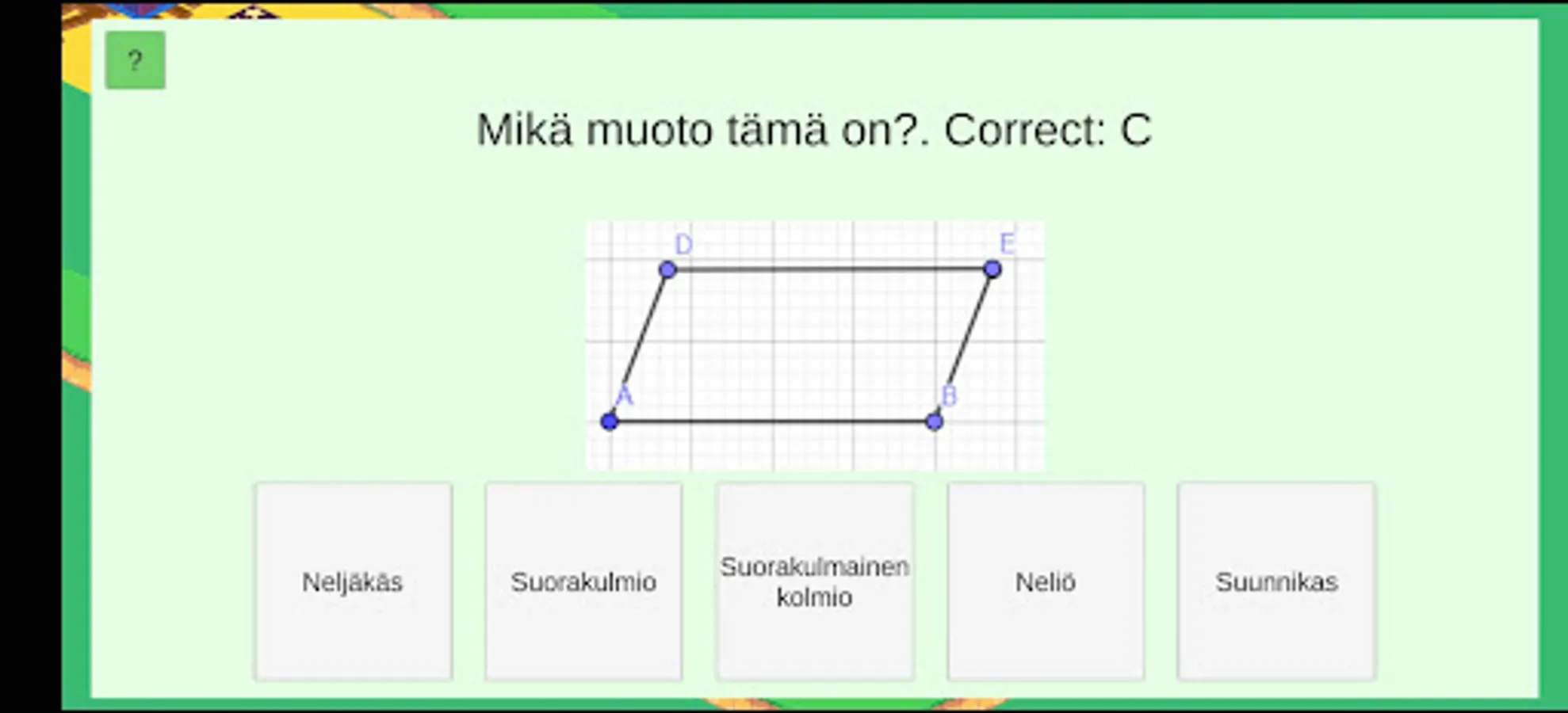 This is an educational math game about geometric elements and their mathematical connections. The game was designed and developed as part of the Erasmus+ funded GAMe-based learning in MAthematics (GAMMA) project. The game is intended for studying mathematics in secondary education (ages 15-18), but it is also suitable as part of middle school geometry teaching.