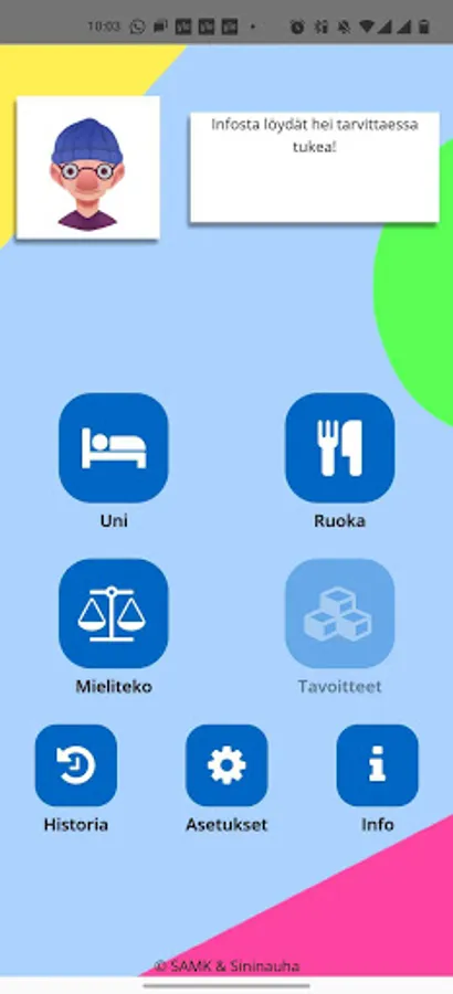In the diary, you can evaluate your own amount and quality of sleep, thoughts and actual meals. From the settings, you can choose the character you like, who will be involved in trotting on your rehabilitation path. The application has been developed as a collaboration between Pori Sininauha, Sataedu Gaming and Satakunta University of Applied Sciences (Satakunta DigiHealth project, ERDF). The diary is based on a thesis in the social field at SAMK.