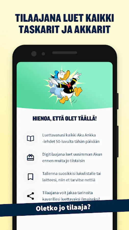 The Aku Ankka digital service application is free. If you do not yet have a subscription to the digital service, you can read the Aku Ankka magazines and the Aku Anka Pocket Book, which have been selected as sample magazines, and get to know the features of the service.