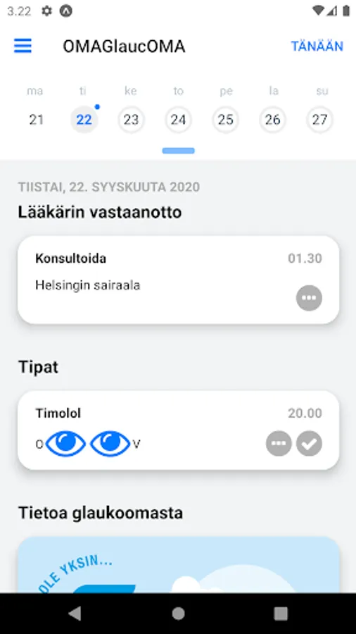 OMAGlaucOMA reminds you to use daily eye drops. You can also keep track of when you have dropped eye drops, what your eye pressure is, and when your next ophthalmologist appointment is. The application can also store research images as well as personal notes.