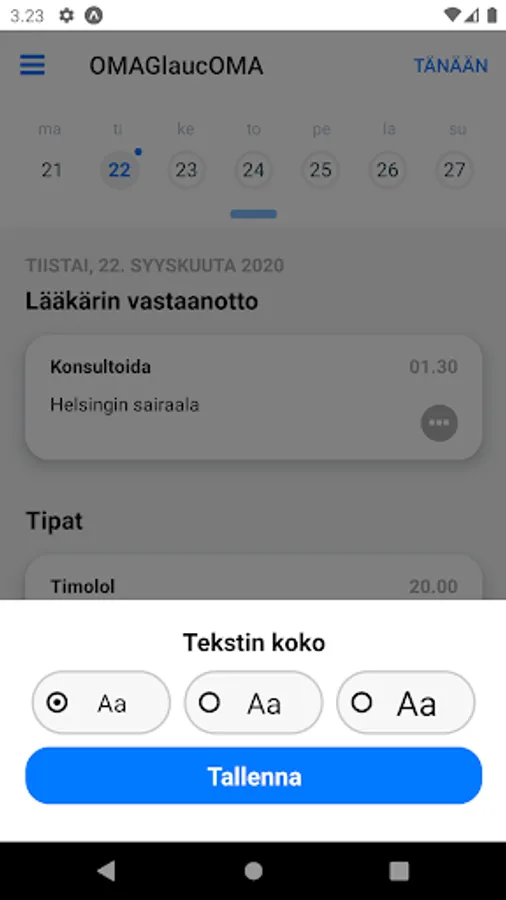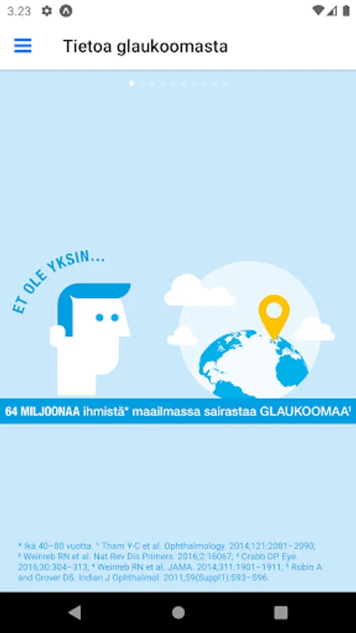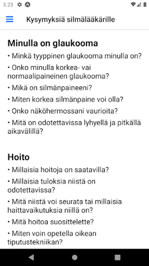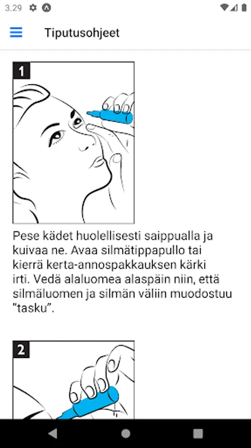 The application provides instructions for administering eye drops and general information about glaucoma. If necessary, you can change the size of the text. For the visually impaired, the application provides instructions on how to use the phone (TalkBack).