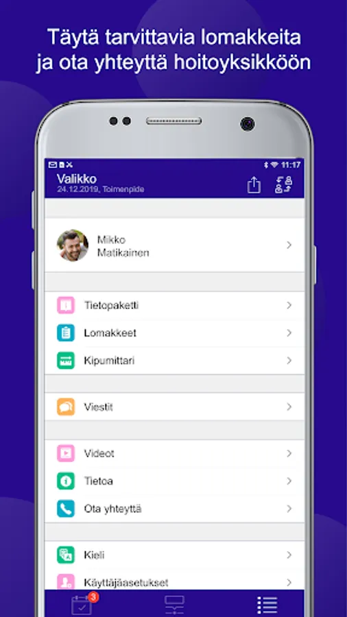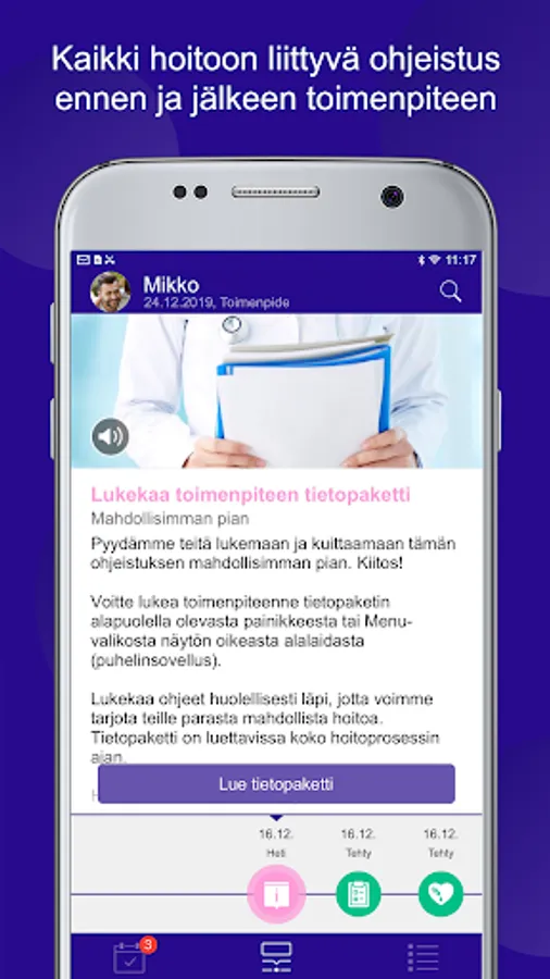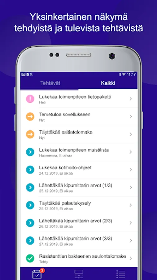 The Satasairaala Mobiiliapuri application offers its user all the information related to treatment in an easy-to-understand format. From the timeline, the patient can see events and tasks related to their treatment and acknowledge them as completed.