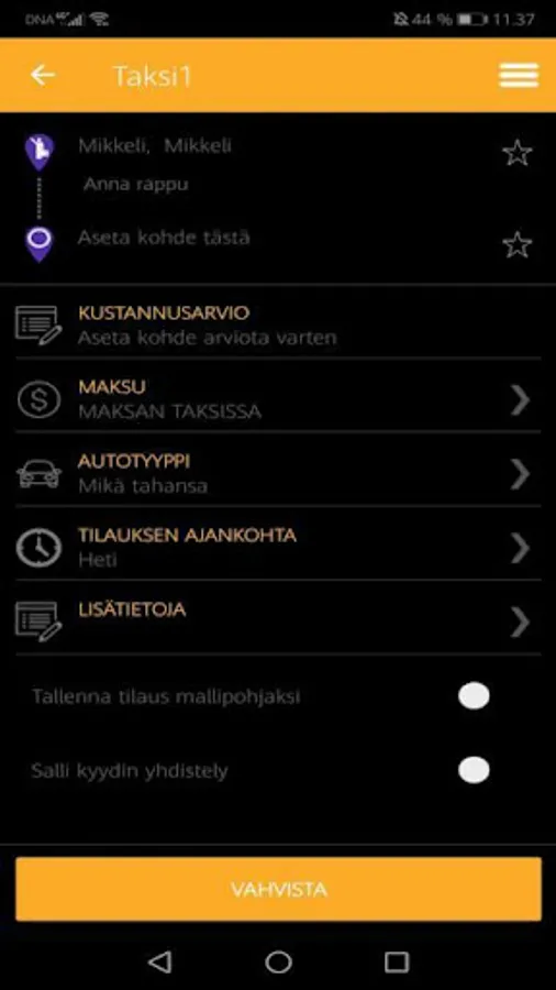 The app will automatically locate your location. Before submitting your order, you will receive a summary of your order. You can refine your location on the map, enter your address yourself, select it from your order history or from your own favorites. By providing the destination address of your trip, the app will estimate the estimated price of the taxi trip for you. When ordering, you can also choose the car type and payment method. Pre-ordering is also possible. The order is free of charge. If you want to use the application to pay for the ride without a car payment, you can enter the desired payment card information into the application. If you do not want your taxi trip to be charged to the card you have entered into the service, you can choose the ride payment method “Pay by taxi” when ordering. In this case, you can normally pay for your trip in the car with cash or the most common payment cards.