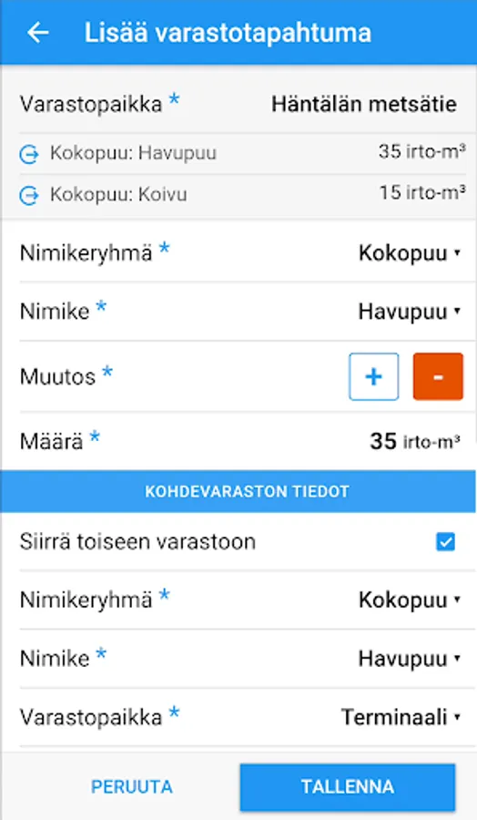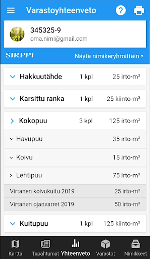 Sirppi Energia calculates total stocks by species. Purchase prices of wood, agreed down payments and contact details of sellers can also be saved in Sirpp. However, it is not mandatory.