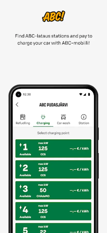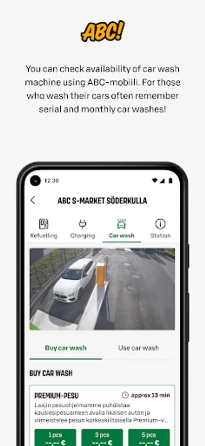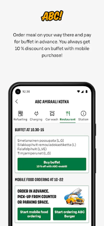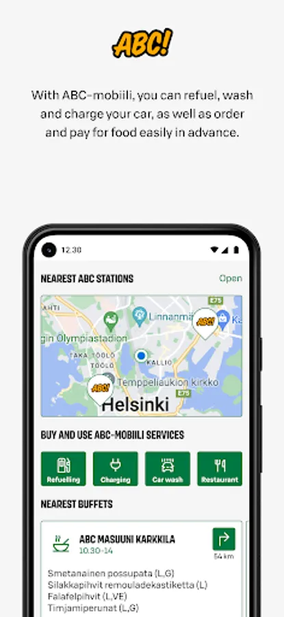 ABC-mobiili app is your handiest co-driver. Use it to refuel, charge or wash your car with only a few taps. You can also use it to order meals for you and your passengers, and to avoid queues when you arrive at the ABC station store. Use ABC-mobiili to find the nearest ABC-lataus station, its available charging points, the highest charging power and the price of the charging. Check out how busy your car wash location is through the queue camera and buy several car washes in advance for a lower price. Remember that you can also get a 10% discount on your buffet lunch when paying with ABC-mobiili! As a co-op member, you earn Bonus points for washing and charging your car and for meal purchases, and a Refuelling Bonus for refuelling when you register using your online banking or S-code credentials.