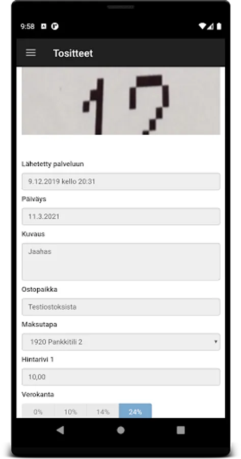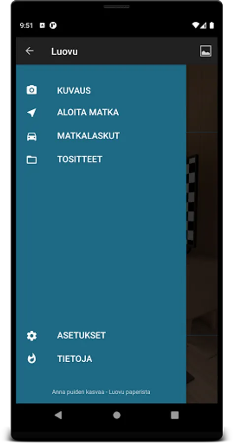 With Luovu, you photograph all your cash receipts and transfer them electronically to an online service from where your accountant takes them to your company's accounting. No more lost receipts or unclear markings. As easy and fast as taking a photo. If you wish, you can enter the voucher's price information, voucher category and other information required for invoicing already at the time of shooting.