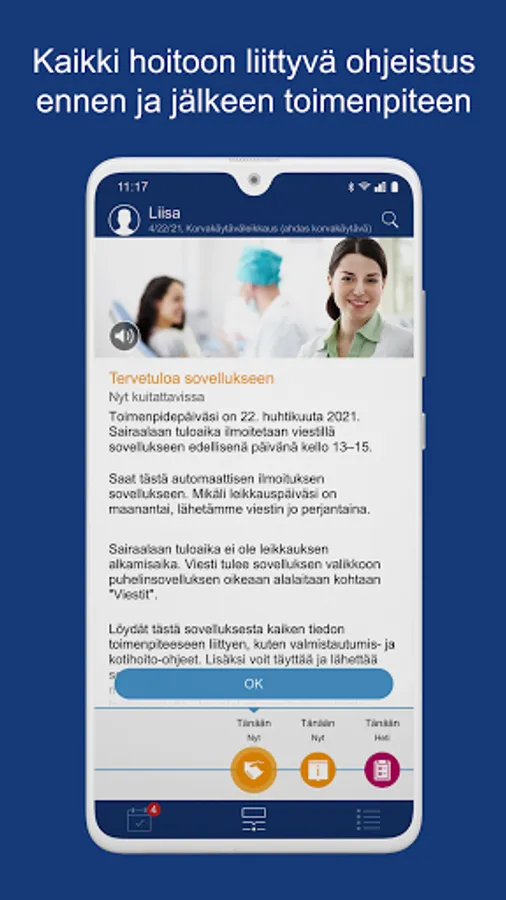 TaysPolku gives you all the information about the procedure in a simple timeline so that you can easily follow the instructions relevant to the treatment. On the timeline you will see all the most important instructions and after reading them you can acknowledge them as done. By following the reminders sent automatically by the app, its use will go great!