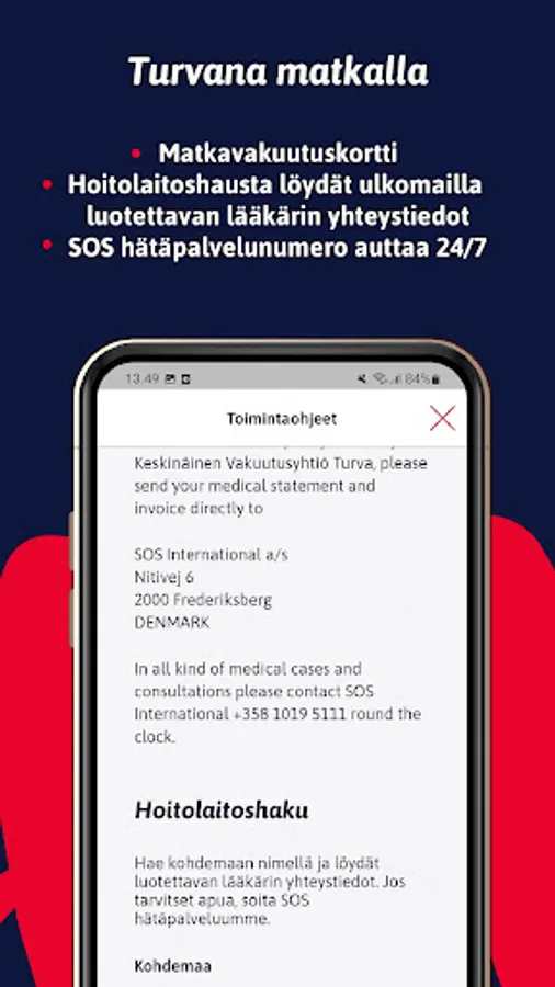 Check out the insurance coverage provided by your union at TaskuTurva. If your association has insured you with travel insurance, a travel insurance card that secures your travels can also be found at TaskuTurva and will always travel with you. The facility search shows the contact information of a trusted doctor on the trip.