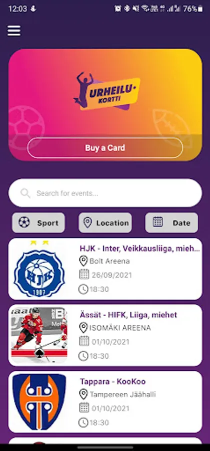 With Urheilukortti (Sports Card), you can attend sports events in Finland. Urheilukortti is digital and you can only use it with the mobile app. All sports events that are available with Urheilukortti can be found through the mobile app, which you can download for free. You only pay for ticket packages (69€ per 5 events). You can find sports events by city, sport and event time. Some sports events are free in which case you don’t need to use your tickets. You can at any time load a new ticket package for 69€.